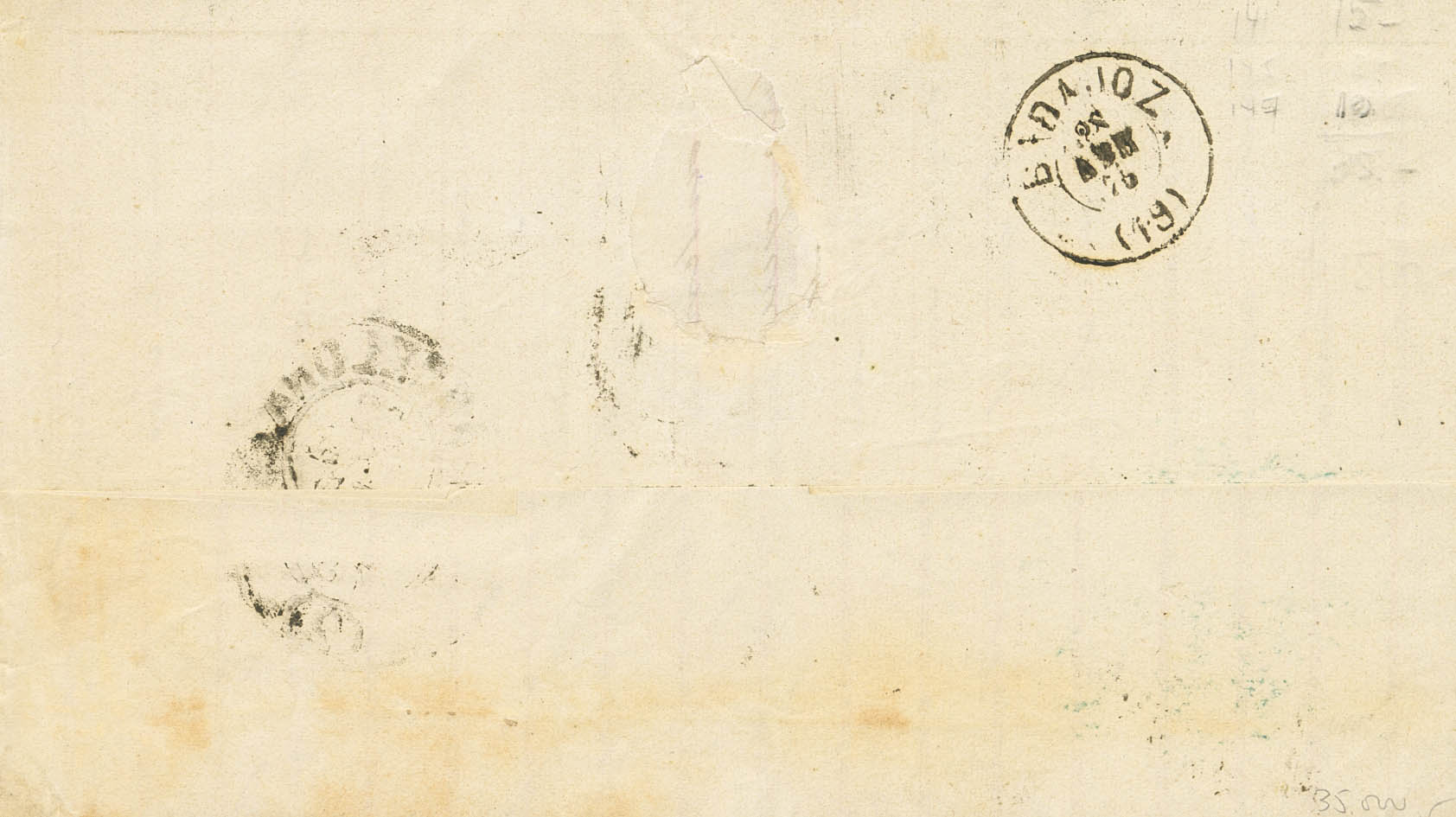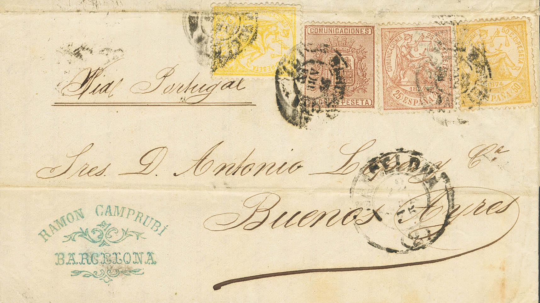 143, 147, 149, 153. 1875. 2 cts amarillo, 25 cts castaño, 50 cts amarillo y 10 cts castaño. BARCELONA a BUENOS AIRES (ARGENTINA). Franqueo de porte simple de 87 cts, según tarifas en vigor por la vía de Portugal. MAGNIFICA Y RARISIMA COMBINACION DE FRANQUEO CON DIFERENTES EMISIONES.