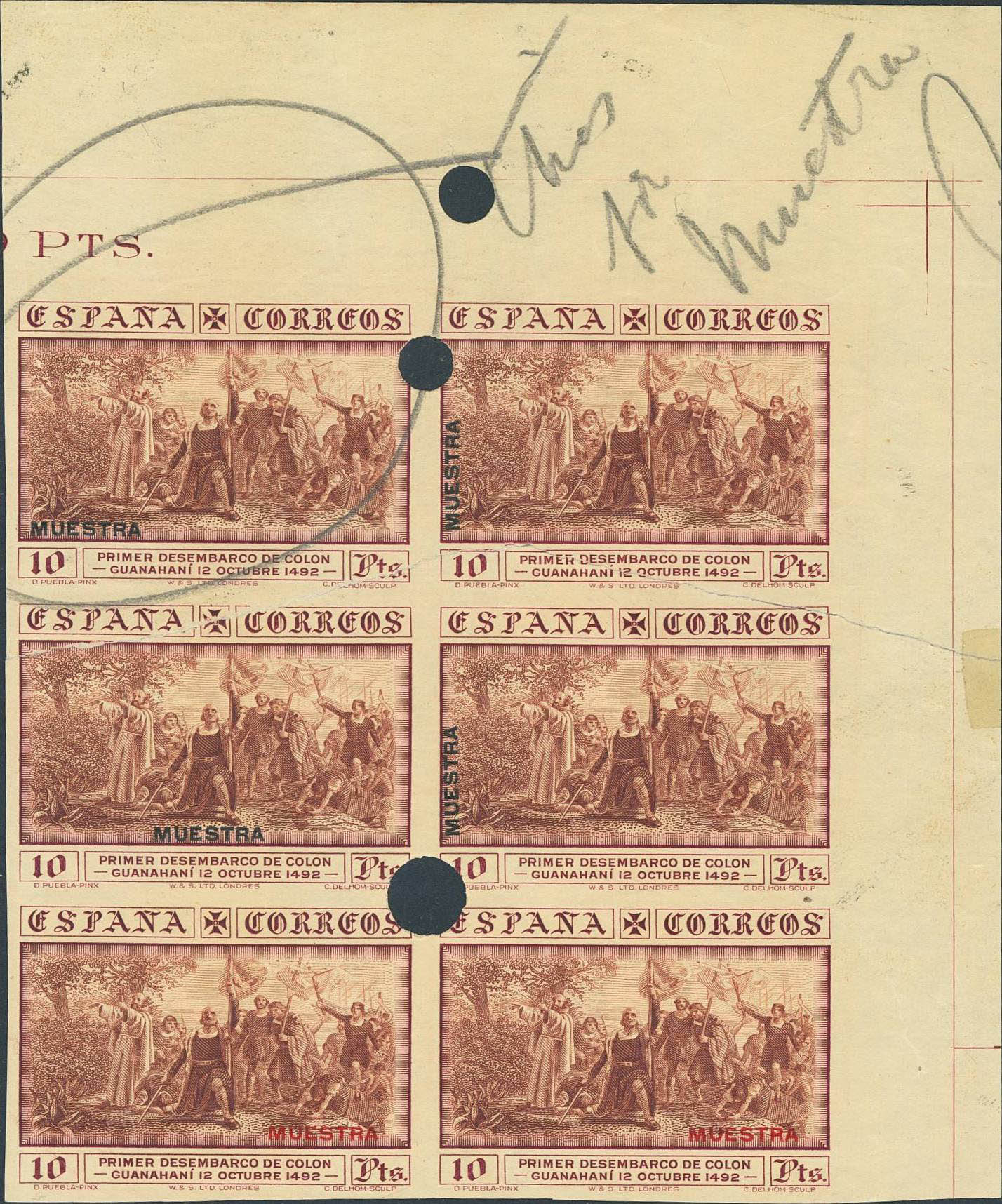 (★) 545MTas(6). 1930. 10 pts castaño y castaño violeta SIN DENTAR, bloque de seis (rotura central que divide el bloque). Cuatro sellos sobrecarga MUESTRA en dos posiciones, en negro y dos MUESTRA, en rojo y taladros angulares con anotaciones de imprenta. MAGNIFICO Y ESPECTACULAR Y MUY RARO.