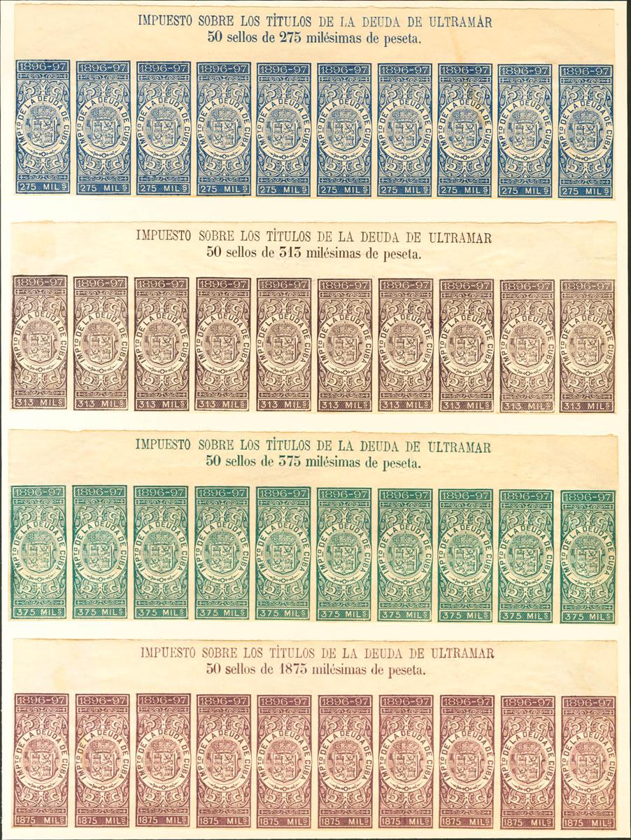 ★★/★1896. Serie completa, ocho valores, tira de diez, cabecera de pliego. TITULOS DE DEUDA DE ULTRAMAR. SIN DENTAR. MAGNIFICA Y MUY RARO CONJUNTO. (Alemany 1/8)