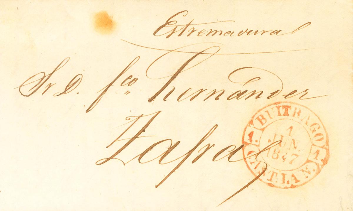 1847. MADRID a ZAFRA, depositada en la administración de BUITRAGO DE LOZOYA. Baeza BUITRAGO / CAST.LA N., en rojo. MAGNIFICA.