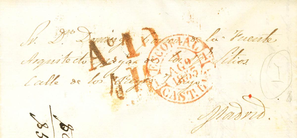 1853. SAN LORENZO DEL ESCORIAL (MADRID) a MADRID. Baeza ESCORIAL / CAST.LA N., en rojo. MAGNIFICA.