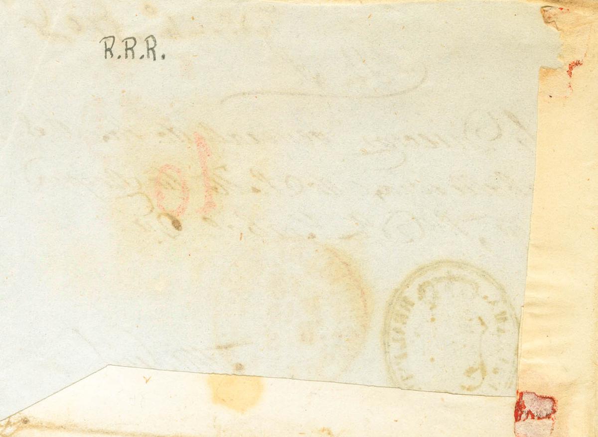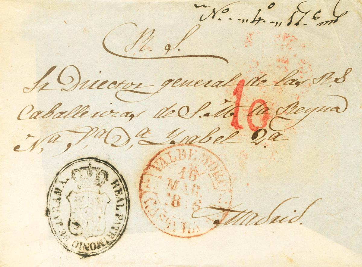 1846. Frontal de VALDEMORO (MADRID) a MADRID. Marca REAL PATRIMONIO DE JARAMA, en negro y Baeza VALDEMORO / CAST.LA N., en rojo. MAGNIFICO Y RARISIMO.
