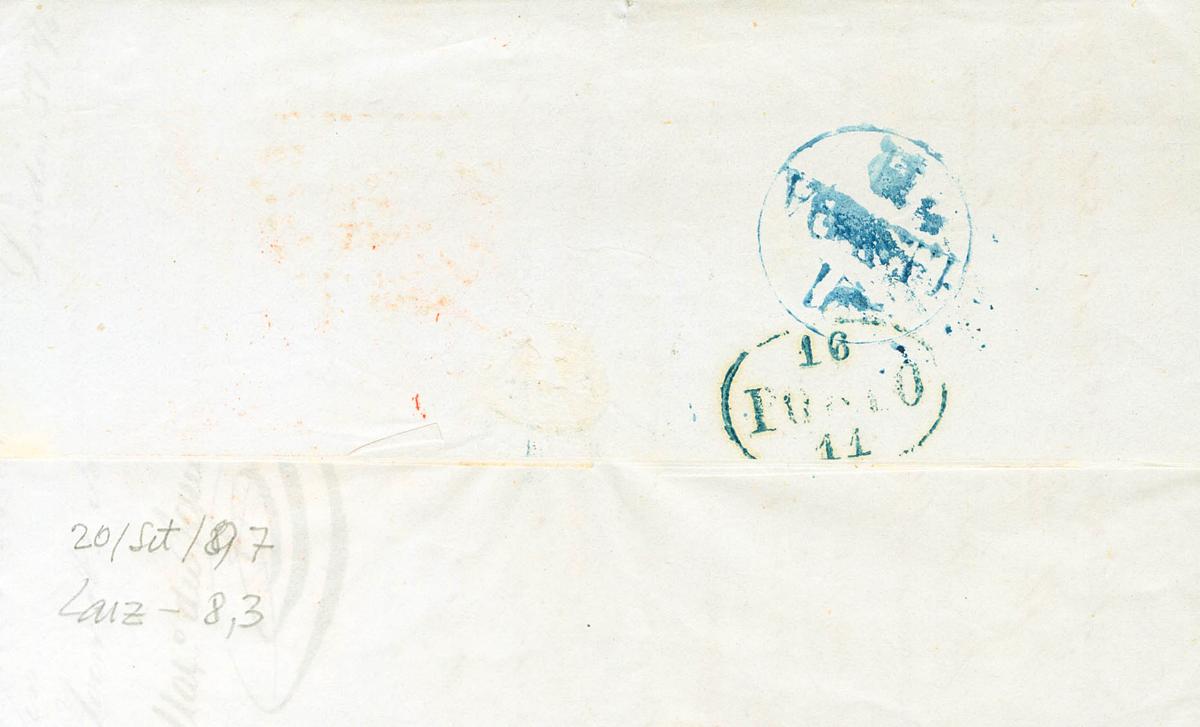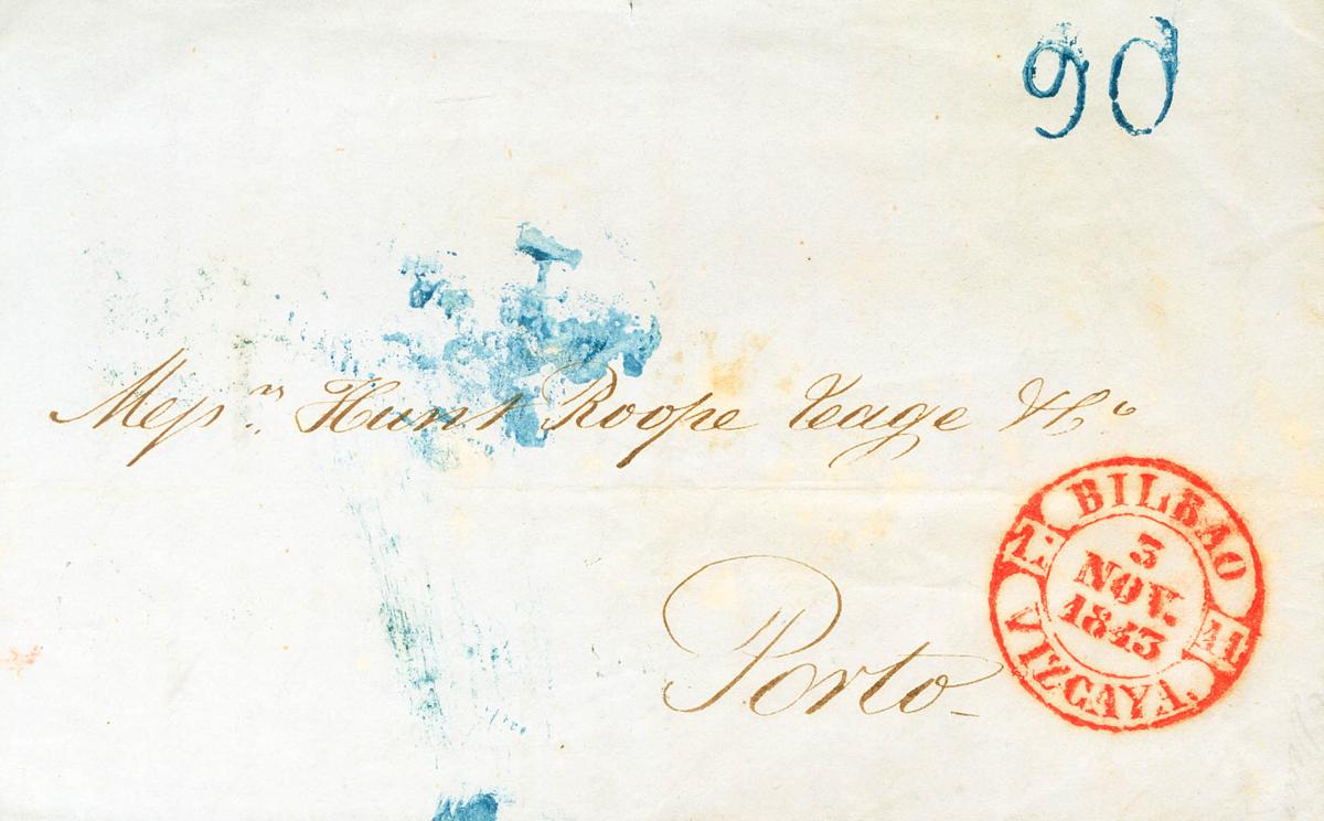 1843. BILBAO a OPORTO (PORTUGAL). Baeza BILBAO / VIZCAYA, en rojo y porteo "90" (reis), en azul. MAGNIFICA Y ESPECTACULAR ESTAMPACION.