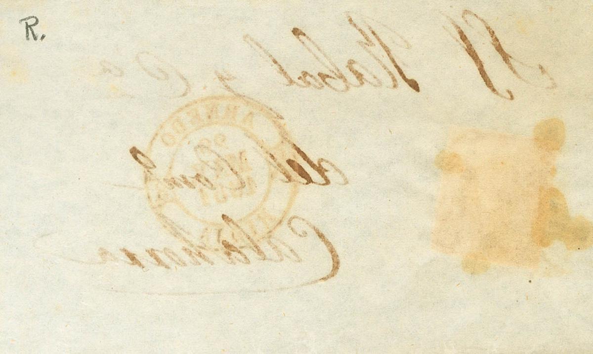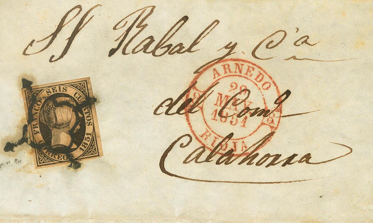 6. 1851. 6 cuartos negro. ARNEDO a CALAHORRA. En el frente baeza (modificado) ARNEDO / RIOJA, en rojo. MAGNIFICA ESTAMPACION.