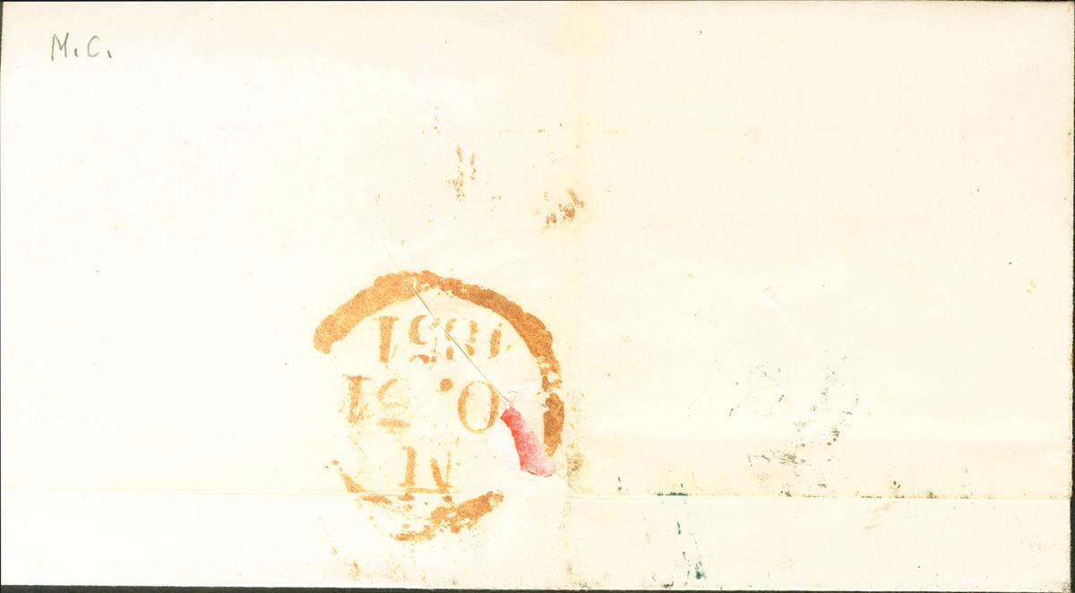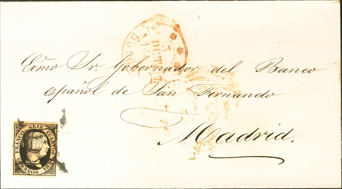 6. 1851. 6 cuartos negro. BURGOS a MADRID. En el frente baeza *** / BURGOS, en rojo. MAGNIFICA.