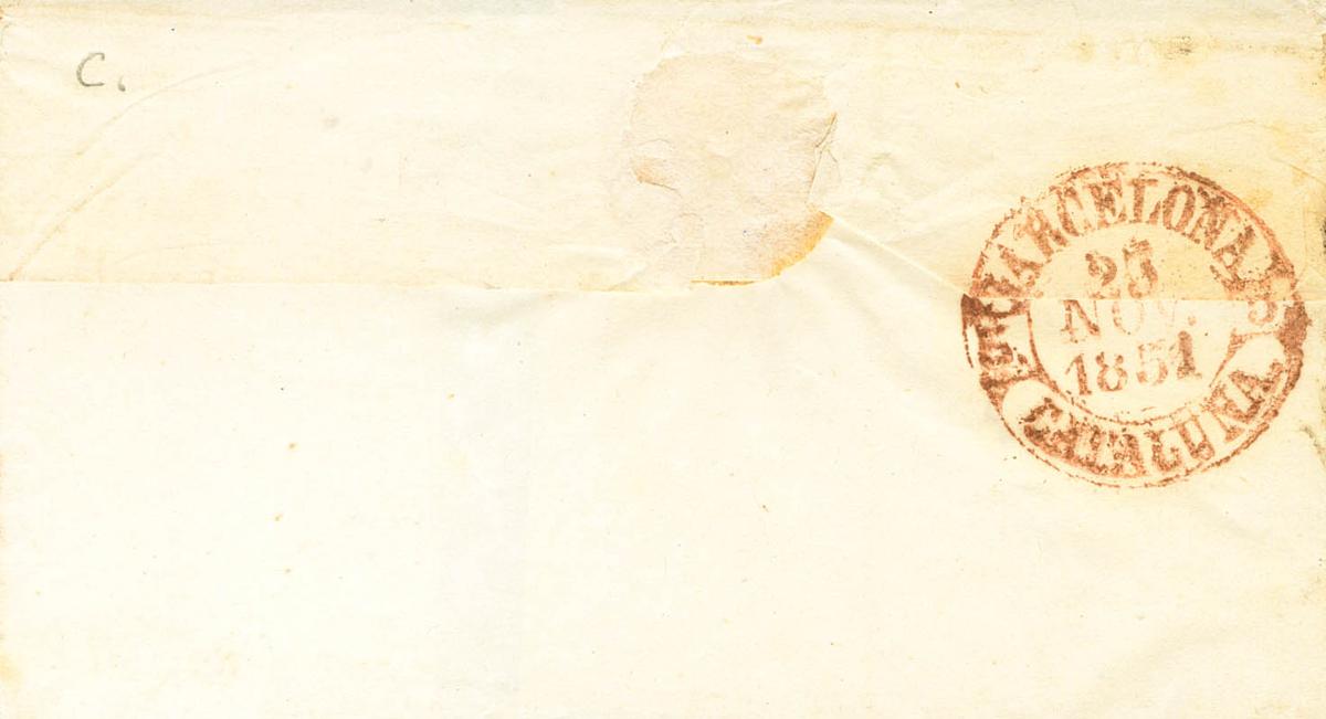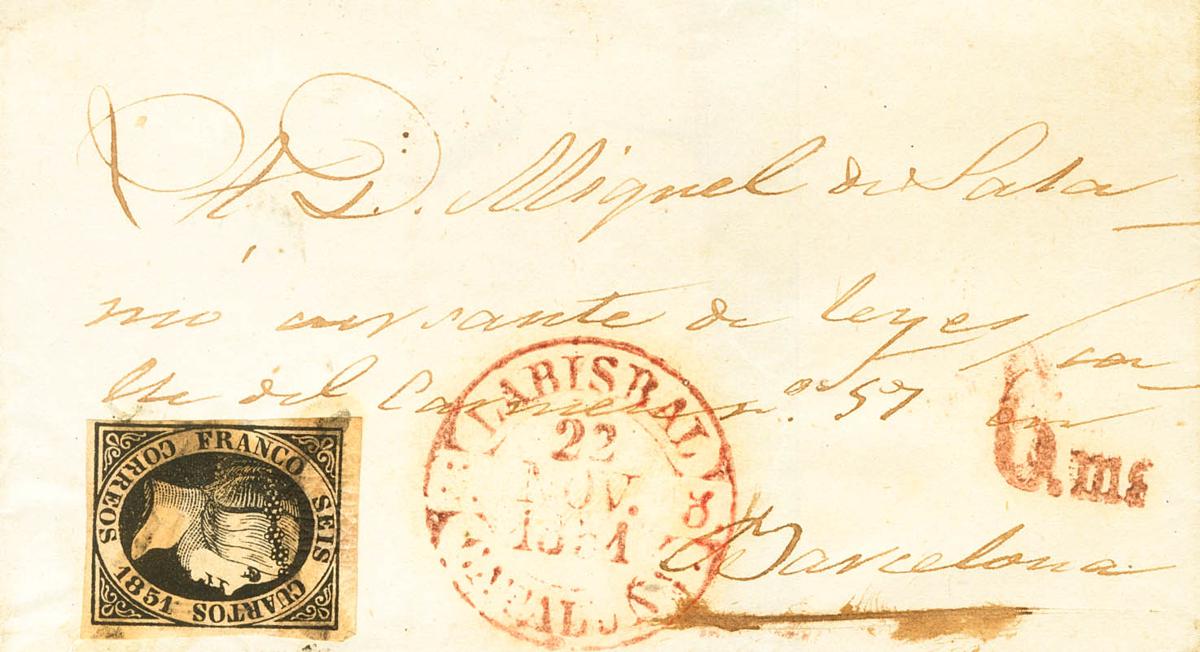 6. 1851. 6 cuartos negro. LA BISBAL a BARCELONA. En el frente baeza LA BISBAL / CATALUÑA, en rojo. MAGNIFICA.