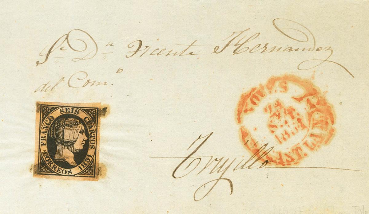 6. 1851. 6 cuartos negro. Frontal de NOVES (TOLEDO) a TRUJILLO. En el frente baeza NOVES / CAST.LA N, en rojo. MAGNIFICO.