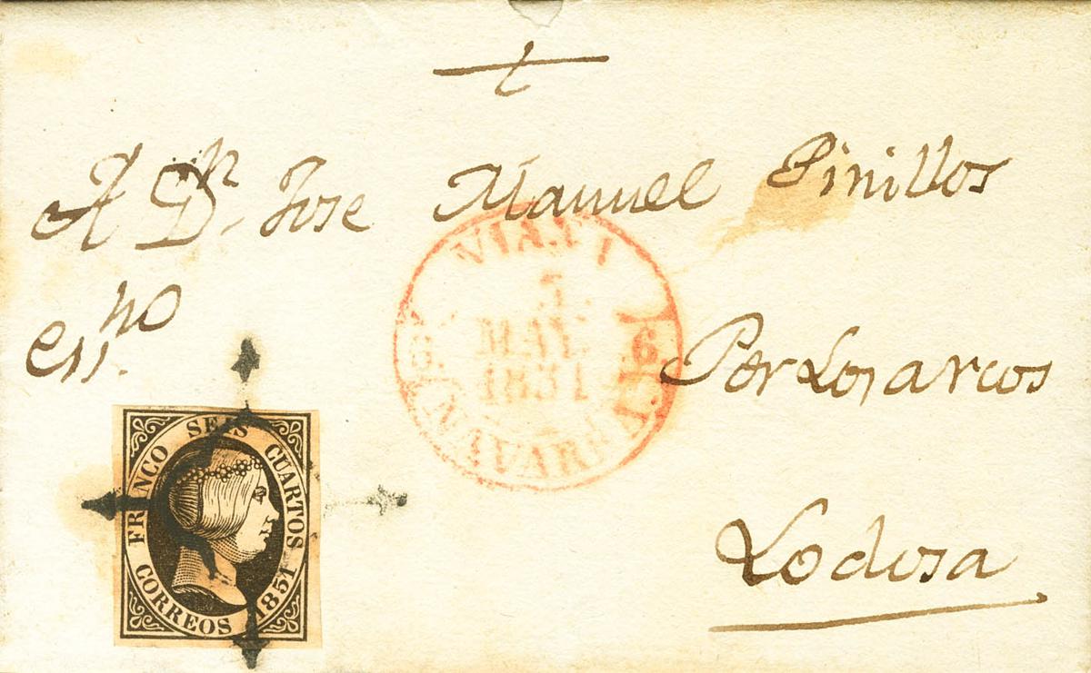 6. 1851. 6 cuartos negro. VIANA a LOSOSA. En el frente baeza VIANA / NAVARRA. MAGNIFICA Y RARA.