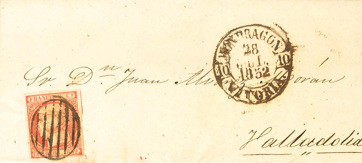 12. 1852. 6 cuartos rosa. MONDRAGON a VALLADOLID. En el frente baeza MONDRAGON / VITORIA, en marrón. MAGNIFICA.