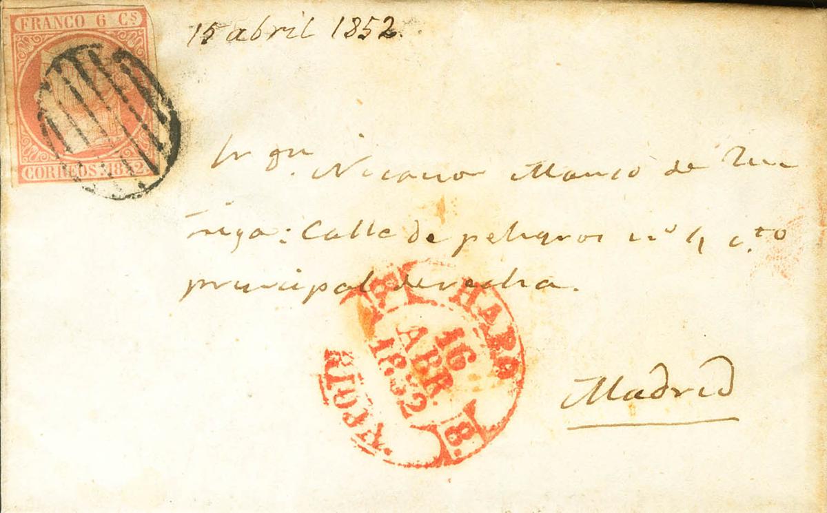 12. 1852. 6 cuartos rosa. MONTALBO DE CAMEROS a MADRID, muy probablemente transportada privadamente hasta Haro. En el frente baeza HARO / RIOJA, en rojo. MAGNIFICA.