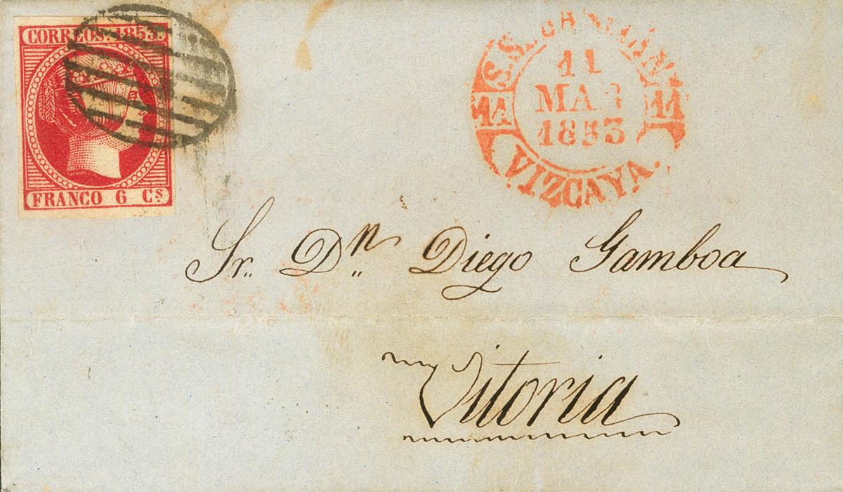 17. 1853. 6 cuartos carmín. SAN SEBASTIAN a VITORIA. En el frente baeza S.SEBASTIAN / VIZCAYA, en rojo. MAGNIFICA.