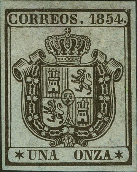 ★★ 29p. 1854. 1 onza negro sobre azul-gris. ERROR DE COLOR. MAGNIFICO Y RARO.