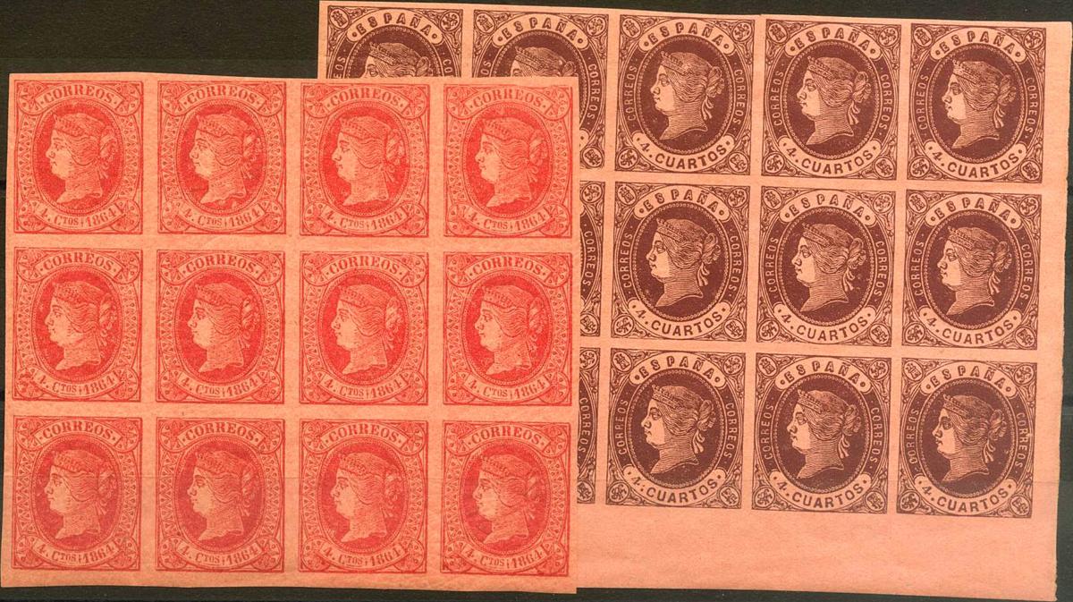 ★★/★ 58(15), 64(12). 1862. 4 cuartos castaño, bloque de quince, esquina de pliego y 4 cuartos rojo, bloque de doce. MAGNIFICOS.