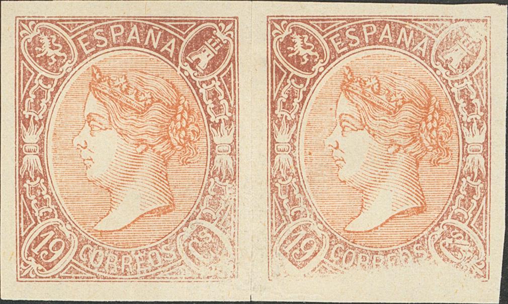 (★) 71P(2). 1865. 19 cuartos castaño y rosa, pareja. ENSAYO DE COLOR, con gran falta de impresión. MAGNIFICA.