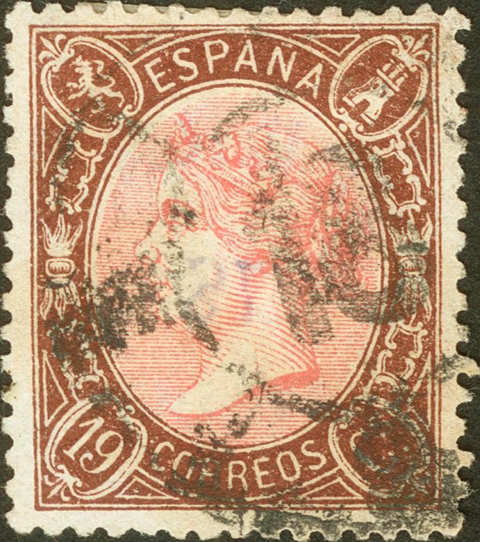 77F. 1865. 19 cuartos castaño y rosa. FALSO SPERATI (Tipo B), al dorso marca de la B.P.A. inutilizado con el matasello R.CARRETA Nº18. MAGNIFICO.