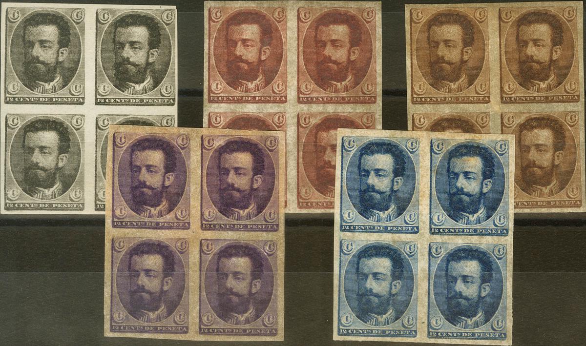 ★/(★)1872. 12 cts negro, 12 cts castaño, 12 cts carmín rojo, 12 cts violeta y 12 cts azul, bloques de cuatro. ENSAYOS DE COLOR, sobre papel apergaminado. MAGNIFICOS.
