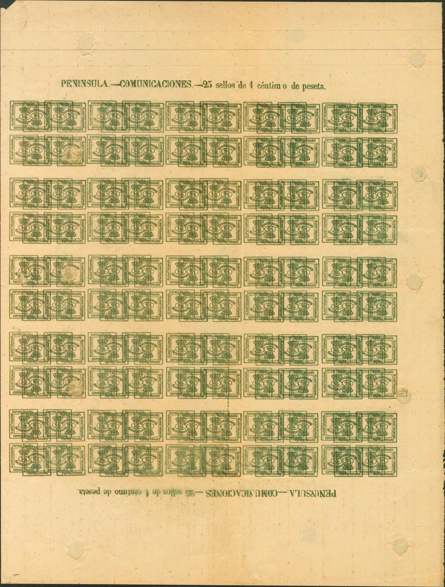 (★) 173edi(50). 1876. 4/4 cts verde, hoja completa de cincuenta sellos (dos con defecto) y seis con perforación. DOBLE IMPRESION y UNA INVERTIDA. BONITA Y RARA. Edifil 2020: 1.100 Euros