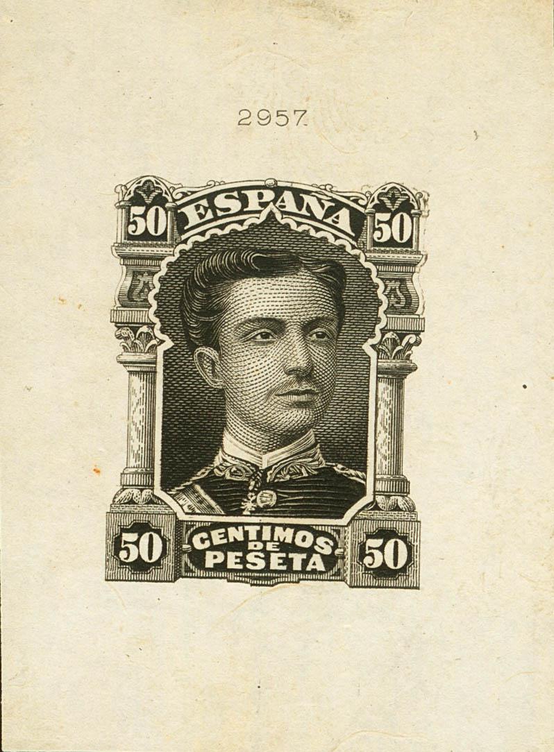 (★)1877. 50 cts negro. PRUEBA DE PUNZON de AMERICAN BANK NOTE, de un diseño no adoptado, con numeración en la parte superior. MAGNIFICA Y MUY RARA.