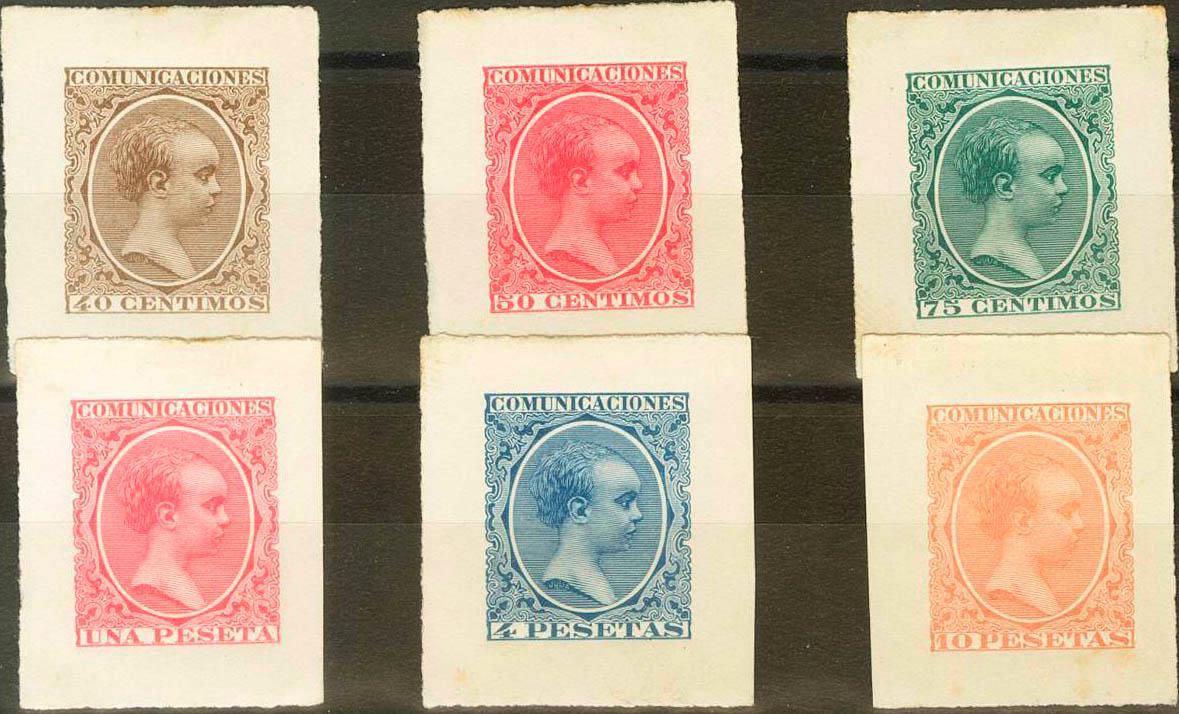 (★) 213/28P. 1889. Conjunto de PRUEBAS DE PUNZON de la serie completa en los siguientes colores 2 cts en azul, 5 cts en naranja, 10 cts en violeta-negro, 15 cts en lila, carmín, violeta-negro, azul, castaño y verde, 20 cts en castaño, 25 cts en azul, 30 cts en verde, 40 cts castaño, 50 cts rosa-naranja, 75 cts verde, 1 pts rosa, 4 pts azul y 10 pts naranja. MAGNIFICO Y EXTRAORDINARIAMENTE RARO CONJUNTO COMPLETO.