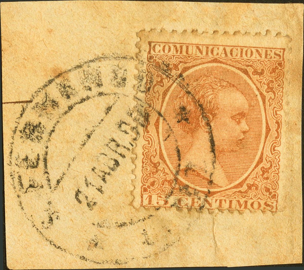 △ 217. 1889. 15 cts castaño amarillo, sobre fragmento. ERROR DE COLOR. Matasello S.FERNANDO / CADIZ. MAGNIFICO Y RARISIMO.