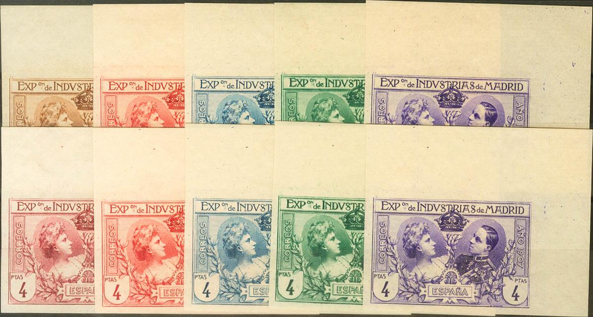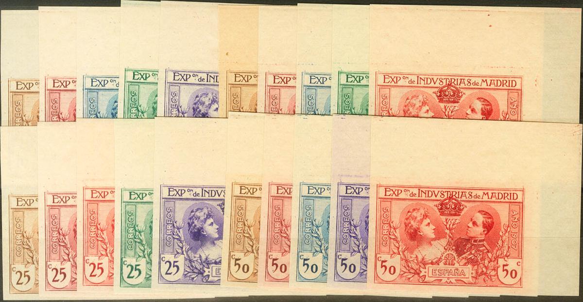 (★) SR1/6. 1907. Conjunto de treinta ENSAYOS DE COLOR de los treinta y seis conocidos (sólo falta la serie con los valores definitivos, deberían de ser los más fáciles de conseguir), todos los valores esquina de pliego. MAGNIFICO Y RARO CONJUNTO DE ENORME ESPECTACULARIDAD Y CON MUCHAS POSIBILIDADES DE SER COMPLETADO.