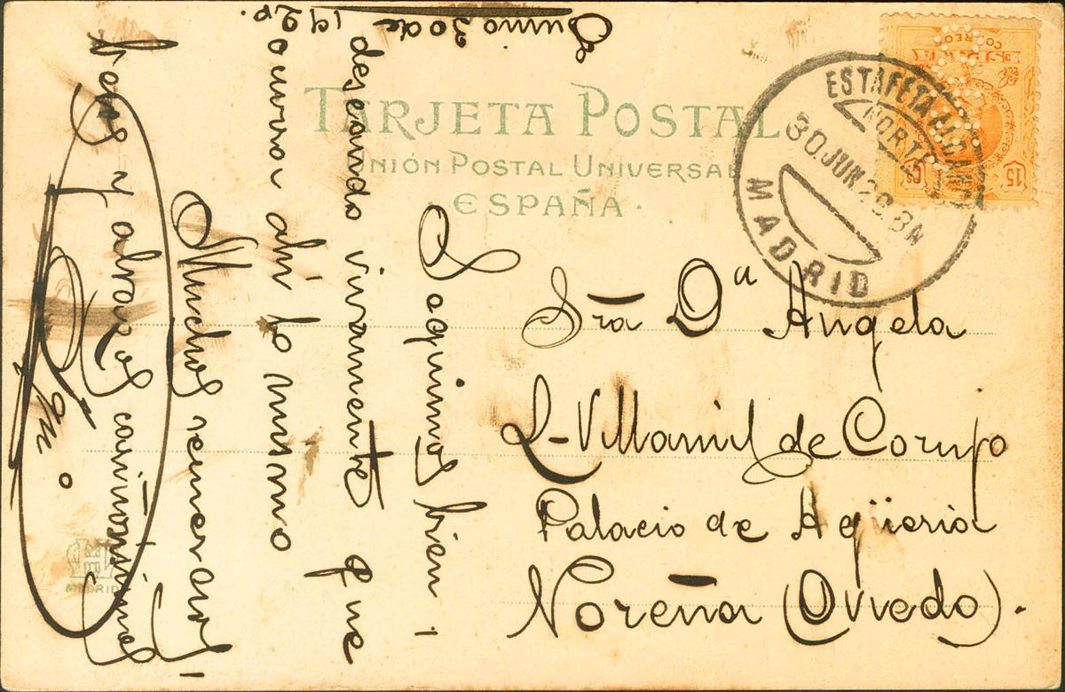 271. 1929. 15 cts amarillo, perforado. Tarjeta Postal de MADRID a NOREÑA (OVIEDO). Matasello ESTAFETA ALCANCE / MADRID. MAGNIFICA.