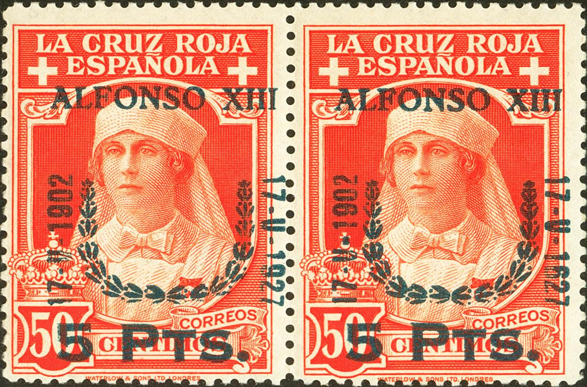 ★★ 385, 385t. 1927. 5 pts sobre 50 cts naranja, pareja. Un sello variedad "1627" EN LUGAR DE "1927". MAGNIFICA.