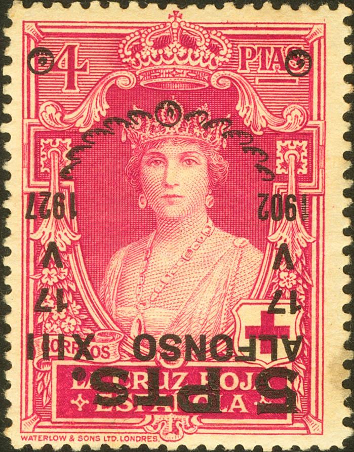 ★ 386hi. 1927. 5 pts sobre 4 pts carmín rosa. SOBRECARGA INVERTIDA. MAGNIFICO.