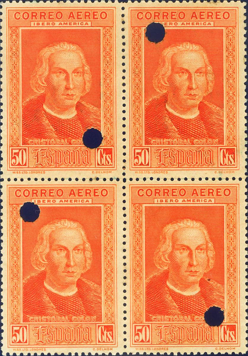 ★★ 562ccMTb(4). 1930. 50 cts naranja, bloque de cuatro. CAMBIO DE COLOR y TALADRO. MAGNIFICO. Edifil 2020: +136 Euros