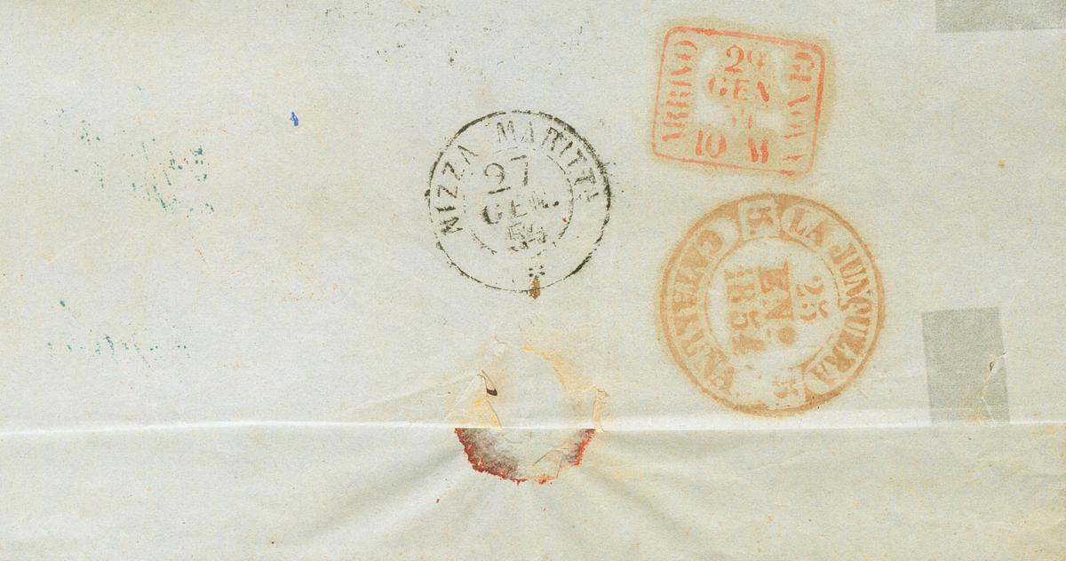 1854. CADAQUES (GERONA) a GENOVA (ITALIA). Baeza CASTON.D.AMPS. / CATALUÑA y marcas ESPAÑA, en azul y VIA DI NIZZA, en negro. MAGNIFICA.