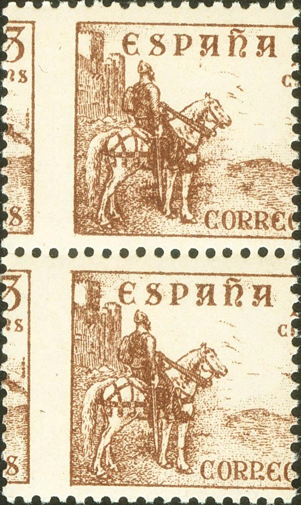 ★★ 1044dv(2). 1949. 5 cts castaño, pareja vertical. DENTADO VERTICAL DESPLAZADO. MAGNIFICA. Edifil 2021: +60 Euros
