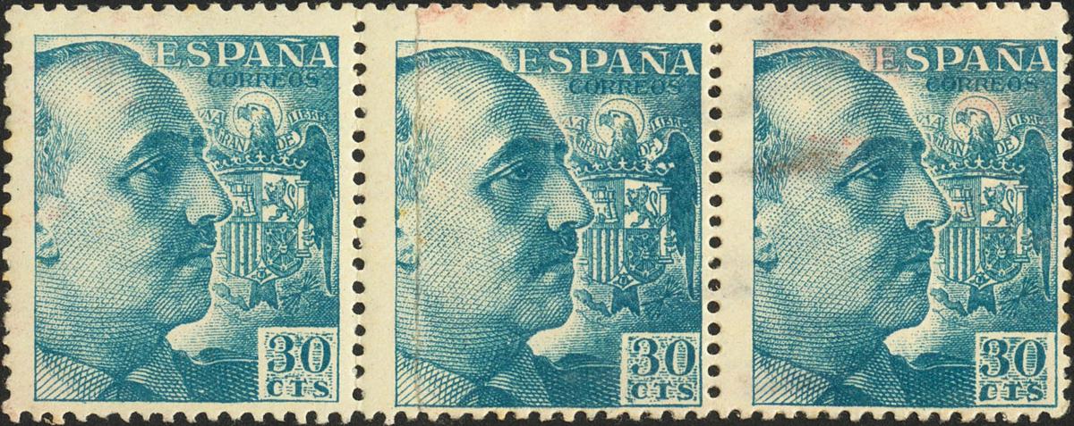 ★ 1050x. 1949. 30 cts azul, tira de tres. Variedad por EMPALME DEL PAPEL. MAGNIFICA Y RARA.