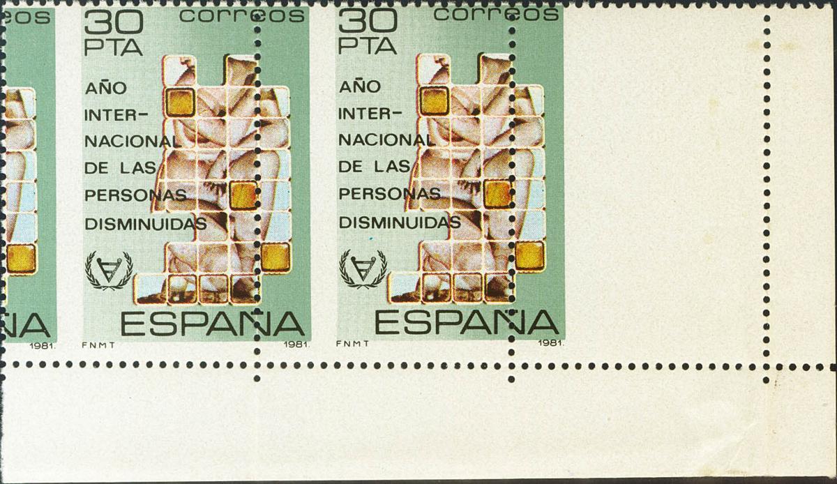 ★★ 2612(2). 1981. 30 pts multicolor, pareja, esquina de pliego. DENTADO VERTICAL DESPLAZADO. MAGNIFICA Y RARA.