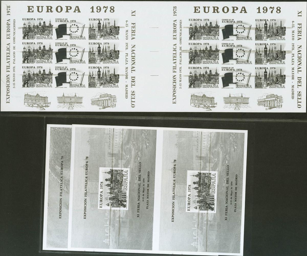 ★★ 60/61. 1978. Conjunto de la serie EUROPA 1978, incluyendo dos hojas recuerdo y una de "promoción", ambas en parejas e impresión en negro e inutilizadas. MAGNIFICAS Y RARAS.