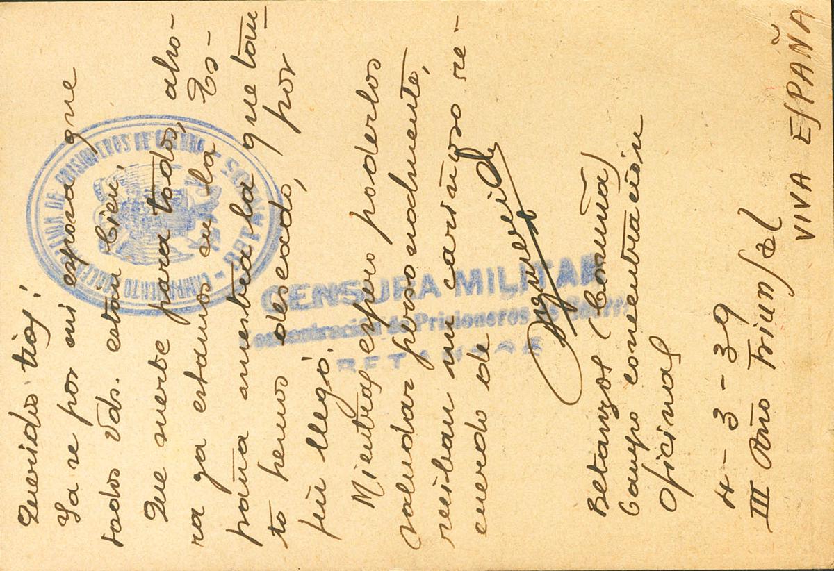 1939. Tarjeta Postal de BETANZOS a BARCELONA. Al dorso marcas CAMPAMENTO CONCENTRACION DE PRISIONEROS DE GUERRA / BETANZOS y CENSURA MILITAR / CONCENTRACION DE PRISIONEROS DE GUERRA / BETANZOS, ambas en azul. MAGNIFICA Y MUY RARA, ESTE CAMPO SOLO ESTUVO EN FUNCIONAMIENTO HASTA MAYO DE 1939. (Allepuz 359)