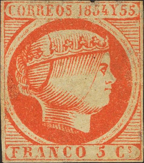 (★) 5. 1855. 5 cuartos rojo (leve adelgazamiento). Del Tipo I o también llamado "círculo cortado" existen cuatro subtipos (que conforman el bloque reporte), unos de ellos tiene el círculo completo a semejanza del raro Tipo II, que genera ciertas confusiones, y es precisamente este ejemplar (para darnos una idea de la dificultad, este sello está erróneamente certificado por la Philatelic Foundation como el "círculo completo"). Color muy intenso. MAGNIFICO Y RARISIMO. Cert. CEM.