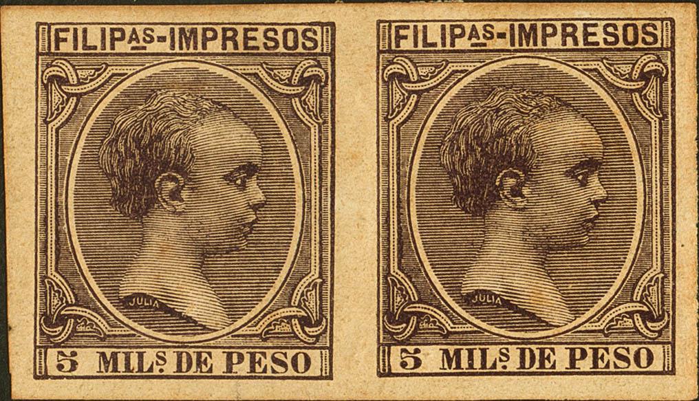 ★ 78s(2). 1890. 5 mils violeta negruzco, pareja. SIN DENTAR. MAGNIFICA Y MUY RARA. Cert. CEM. Edifil 2022: 200 Euros