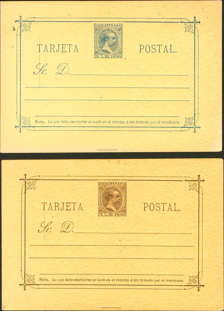 (★) EP10/11. 1896. 2 ctvos azul y 3 ctvos castaño sobre Tarjetas Entero Postales. MAGNIFICAS. Edifil 2022: 117 Euros