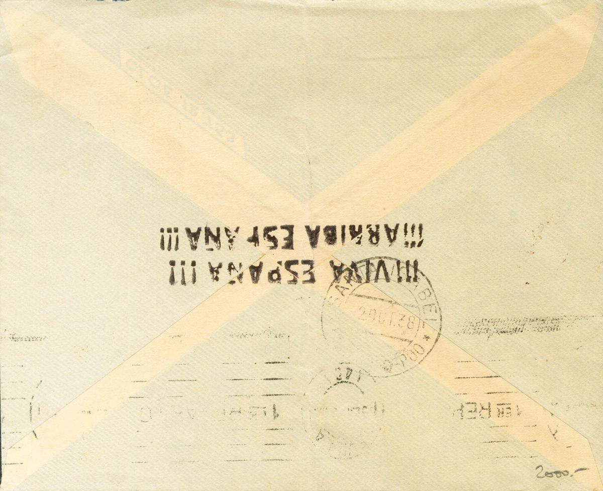 257(2). 1939. 15 cts pizarra, pareja y Local de 50 cts azul. BATA a SEVILLA. MAGNIFICA Y MUY RARA CON EL SELLO LOCAL DE 50 CTS AZUL.