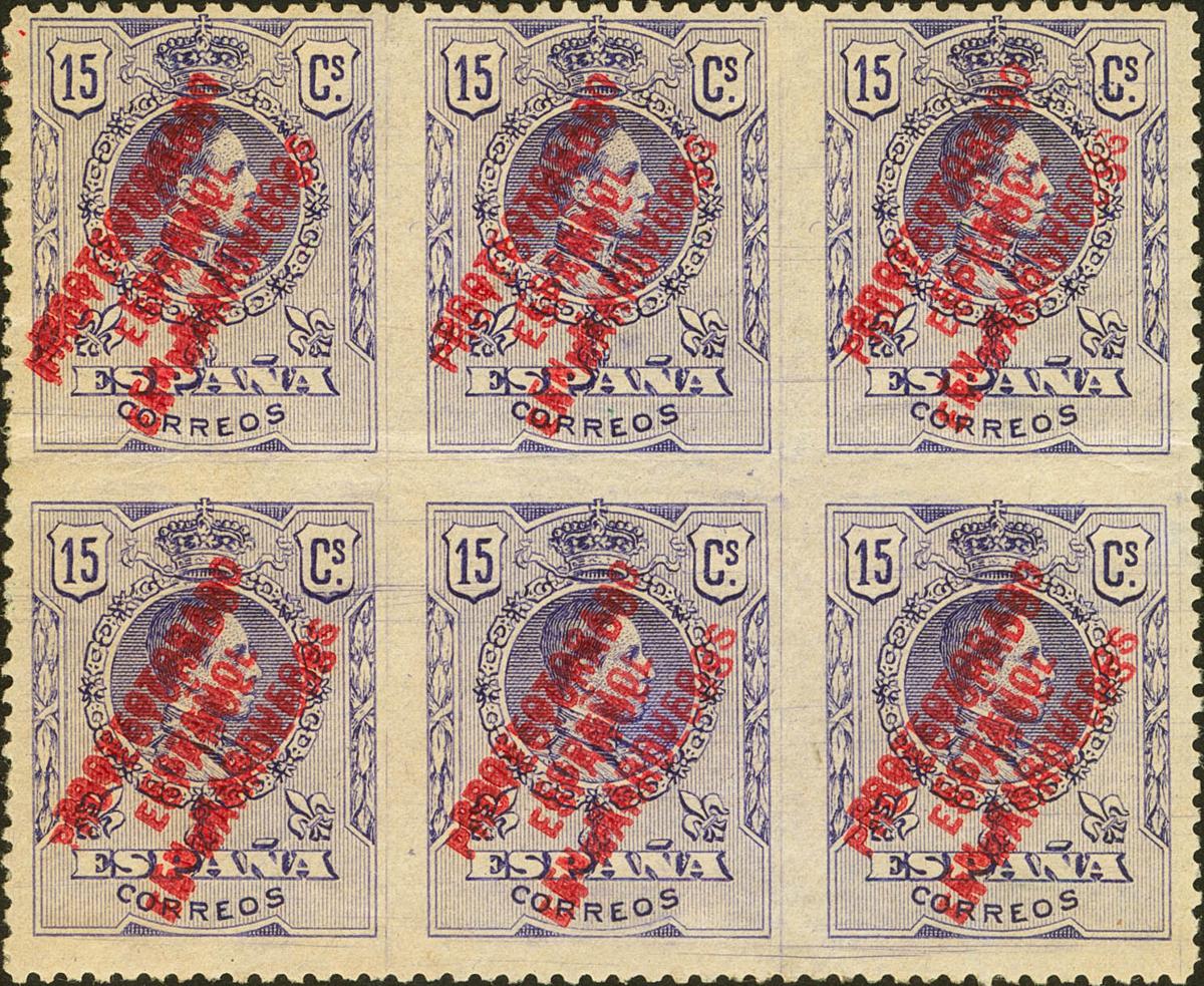 ★ 47hh(6). 1915. 15 cts violeta, bloque de seis. SOBRECARGA DOBLE y SIN DENTAR ENTRE LOS SELLOS. MAGNIFICO Y RARISIMO, POSIBLEMENTE UNICA PIEZA CONOCIDA. Edifil 2018: +++750 Euros