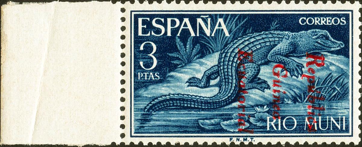 ★★ 54. 1964. 3 pts azul violeta, borde de hoja. Sobrecarga REPUBLICA / GUINEA / ECUATORIAL, en rojo de iniciativa privada. MAGNIFICO Y RARO, NO RESEÑADO.
