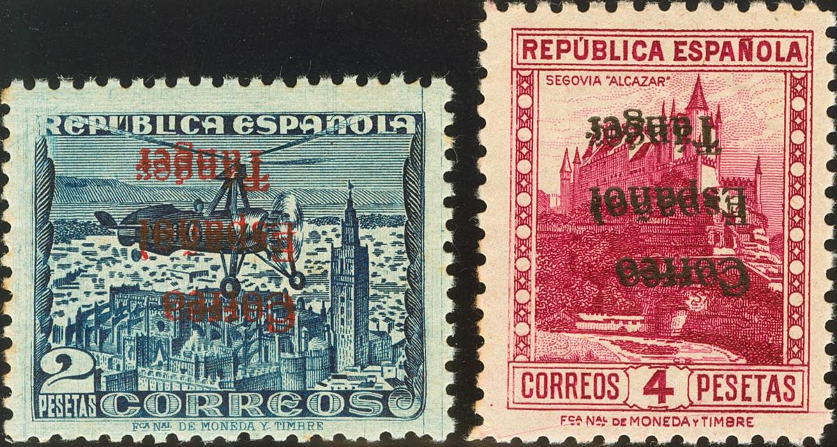 ★★ 106/07hi. 1938. 2 pts azul y 4 pts lila carmín. Variedad SOBRECARGA INVERTIDA DOBLE. MAGNIFICOS Y MUY RAROS, NO RESEÑADOS.