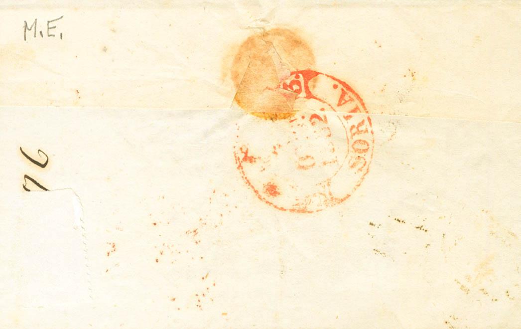 12. 1852. 6 cuartos rosa (defecto en margen izquierdo). BURGO DE OSMA a SORIA. En el frente baeza BURGO DE O. / SORIA. BONITA.