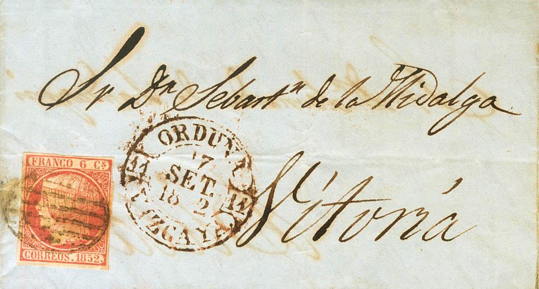 12. 1852. 6 cuartos rosa. ORDUÑA a VITORIA. En el frente baeza ORDUÑA / VIZCAYA, en rojo oxidado. MAGNIFICA.