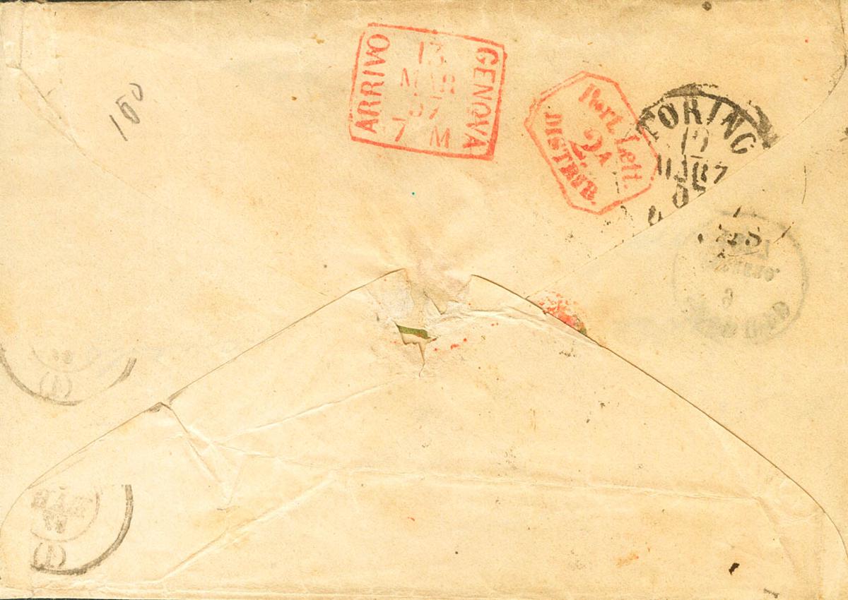 48. 1857. 4 cuartos rojo. MADRID a GENOVA (CERDEÑA). Matasello REJILLA y al dorso diversos tránsitos y llegadas (franqueo de porte simple según real decreto de 29 de Junio de 1853 del Convenio con Cerdeña que establece que las cartas vayan franqueadas con sellos de 6 cuartos, con 4 cuartos cuando se retiran los de 6 cuartos). MAGNIFICA Y MUY RARA.