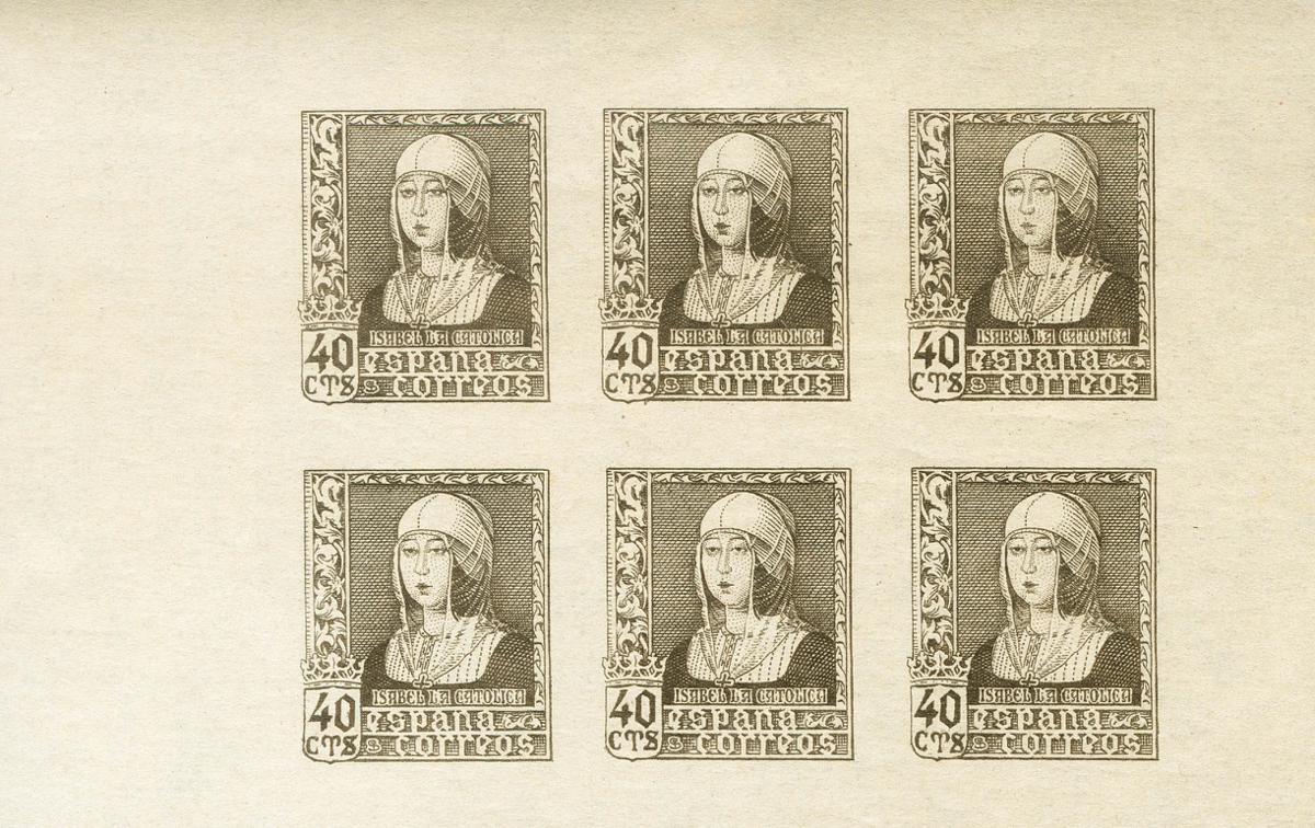 ★★ 858P. 1938. 40 cts gris negro, bloque de seis. PRUEBA DEL BLOQUE REPORTE. MAGNIFICA Y RARISIMA. (Gálvez 3556)