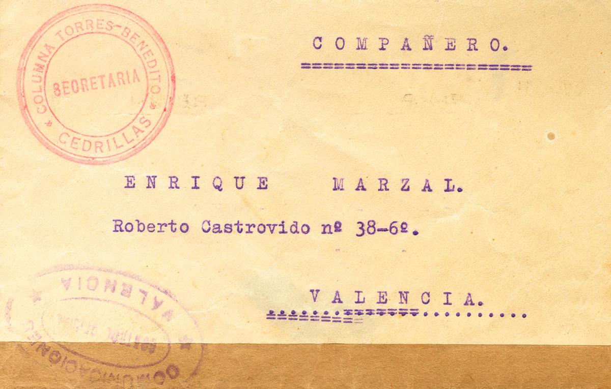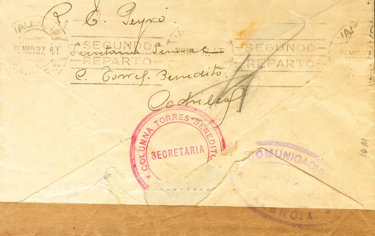 1937. CEDRILLAS (TERUEL) a VALENCIA. Marcas COLUMNA TORRES-BENEDITO / SECRETARIA / CEDRILLAS, en rojo y marca de censura de Valencia (esta columna se formó con soldados de diversos regimientos y voluntarios de C.N.T., U.G.T. y POUM, comandada por el anarquista Domingo Torres y el teniente José Benedito). MAGNIFICA Y RARISIMA.