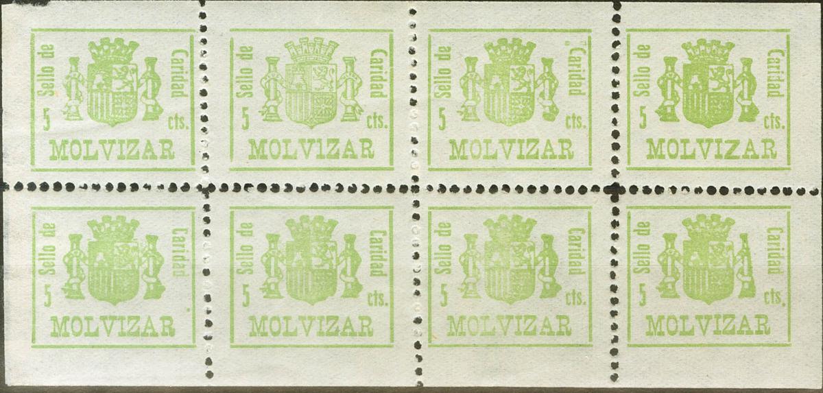 ★★1937. MOLVIZAR (GRANADA). 5 cts verde amarillo, hoja completa de ocho sellos. Contiene variedades de cliché. MAGNIFICA. (Fesofi 1, Allepuz 1)