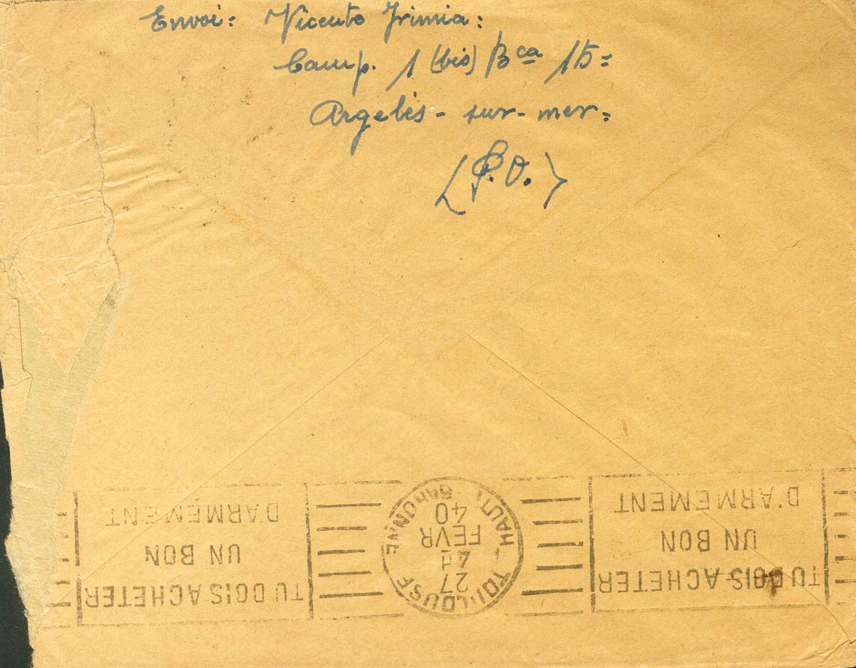 1940. 90 cts azul de Francia, sobrecarga F. ARGELES SUR MER a TOULOUSE. Matasello CAMP ARGELES SUR MER / PYR.ORLES, al dorso llegada. MAGNIFICA Y RARA.