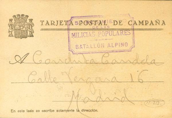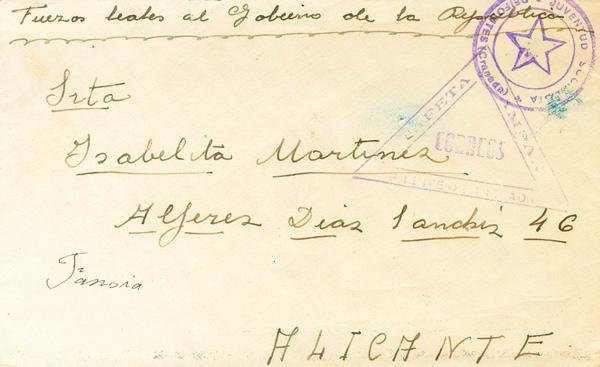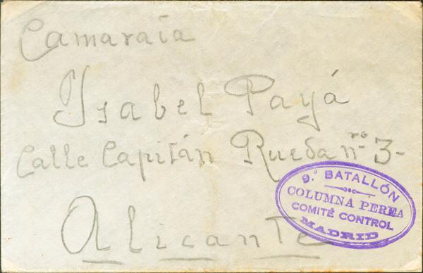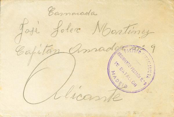 1936. GARGANTILLA DE LOZOYA (MADRID) a ALICANTE. Marca PARTIDO SINDICALISTA / REGIMIENTO PESTAÑA Nº9 / 1ER BATALLON / MADRID, en violeta (denominado asà en honor a Angel Pestaña, perteneciente al Partido Sindicalista), al dorso llegada. MAGNIFICA Y RARA.